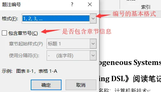 编号:编号按钮可以对当前题注类型的标号类型进行设置,点击后会弹出以下窗口。其中,格式按钮可以选择进行编号的基本格式,如数字"1,2,3",字母"a,b,c"或者"i,ii,iii"等。用户还可以设置是否在编号中加入章节信息等。对编号的设置在通过确定按钮返回后,会直接在 题注 窗口中显示具体的效果。