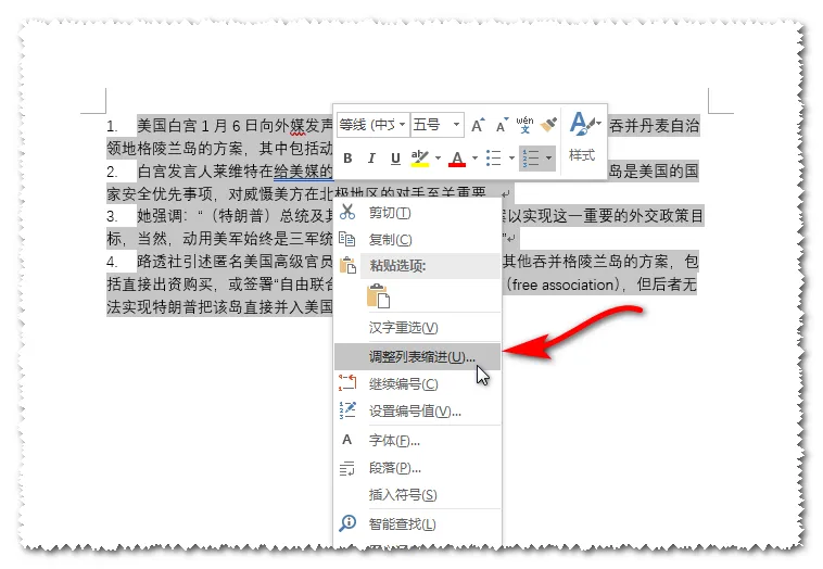 选择文字,右键菜单选择“调整列表缩进”。