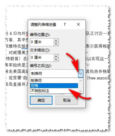 打开“调整列表缩进量”。在编号之后下拉列表中选择空格。