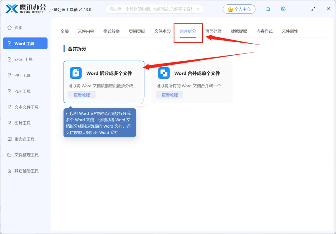 1、安装并打开「鹰迅批量处理工具箱」,在「Word工具」中,选择合并并拆分下的「Word 拆分成多个文件」功能。