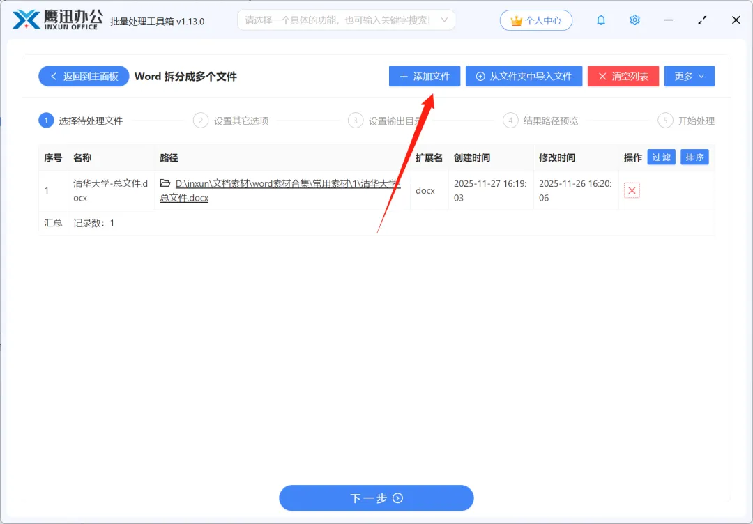 2、添加需要拆分的Word文档,这里可以同时拆分多个Word文档。