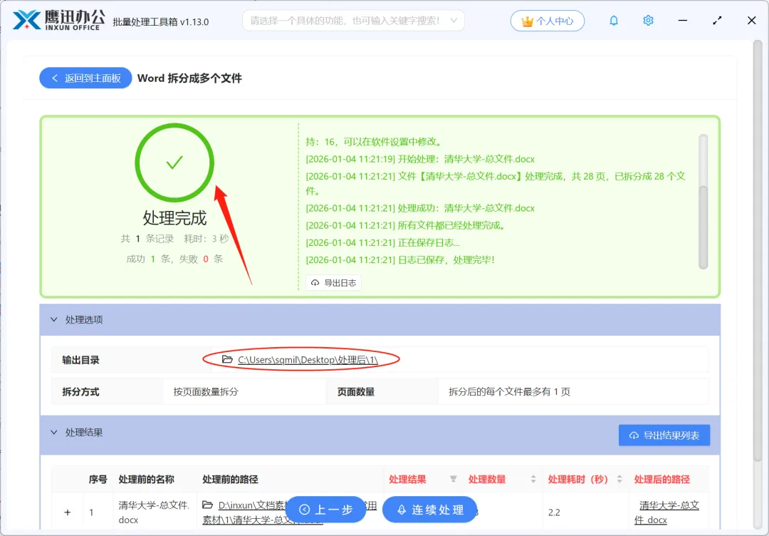几分钟内,您就可以轻松将 Word 文档按页数自动拆分成多个独立文件。操作完成后,界面上将清晰显示处理文件的列表,并标明成功和失败的数量。这种批量拆分 Word 文档的方法,简单易用,极大提高了工作效率。如果您有类似需求,不妨亲自尝试一下,体验快速且高效的文件管理方式。