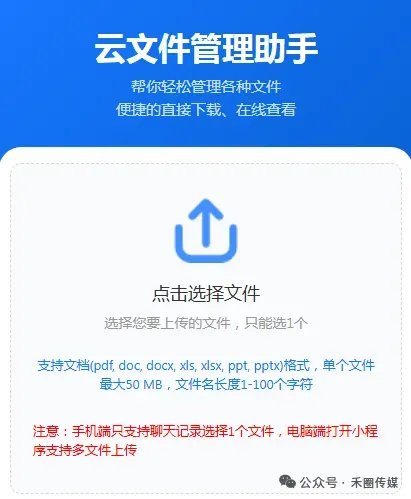现在很多企事业单位也会开通自己的公众号,用于发布招聘信息、产品信息等。人力资源公众号:发布招聘信息 ,需要添加/插入岗位报名word、pdf、excel等文档附件;企事业单位公众号:同城政务的发布公告名单表,也需要添加/插入word、pdf、excel等文档附件;各大院校公众号:文章都需要添加招生招生简章、报名表文档附件等。除了文字、图片外,音频、视频、小程序都可以展示在公众号文章中,但公众号文章怎么添加附件?微信公众号附件上传入口在哪里?今天帮你轻松解决,如何快速在微信公众号文章插入附件文档到公众号文章。无论是招聘信息表、获奖名单、模板信息表,还是承诺书、说明书、招标书都能轻松上传。这个就是让我工作效率倍增的神器——“禾圈文档”小程序,它彻底解决了公众号上传附件的难题。“禾圈文档”是一款专为公众号运营者设计的小程序,该小程序把复杂数据表格及文档快速上传,能在公众号文章中直接插入可下载的附件,读者无需下载即可在线查看!• 支持多种格式:支持文档(pdf、doc、docx、xls、xlsx、ppt、pptx)格式,上传单个文件最大50MB,文件名长度1-100个字符;• 在线预览与下载:读者可选择在线预览查看或直接下载;使用“禾圈文档”在公众号插入附件,只需以下4个简单步骤:1、在微信搜索“禾圈文档”小程序,点击进入直接可以使用。2、点击“上传文件”,从聊天记录或文件助手中选择需要上传的文件上传。3、上传成功后,在文件管理页面找到刚上传的文件,点击“一键复制粘贴”按钮,跳转到下个页面,点击“一键复制”。点击下方名片,看更多融水大小事