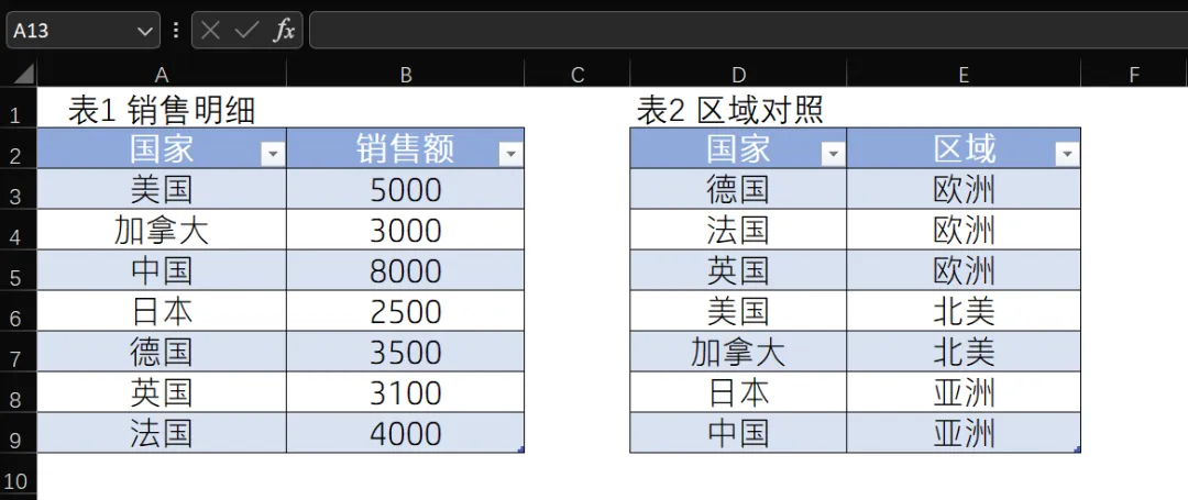 下图中有两份数据,分别是销售明细和国家-区域的对照表,如果想要按区域汇总销售额,通常的做法是在C列通过vlookup之类的函数将区域匹配到销售明细中,然后创建透视表。这样有一个缺点,就是当你的数据量特别大时,公式的计算会极大的拖慢表格的反应速度。