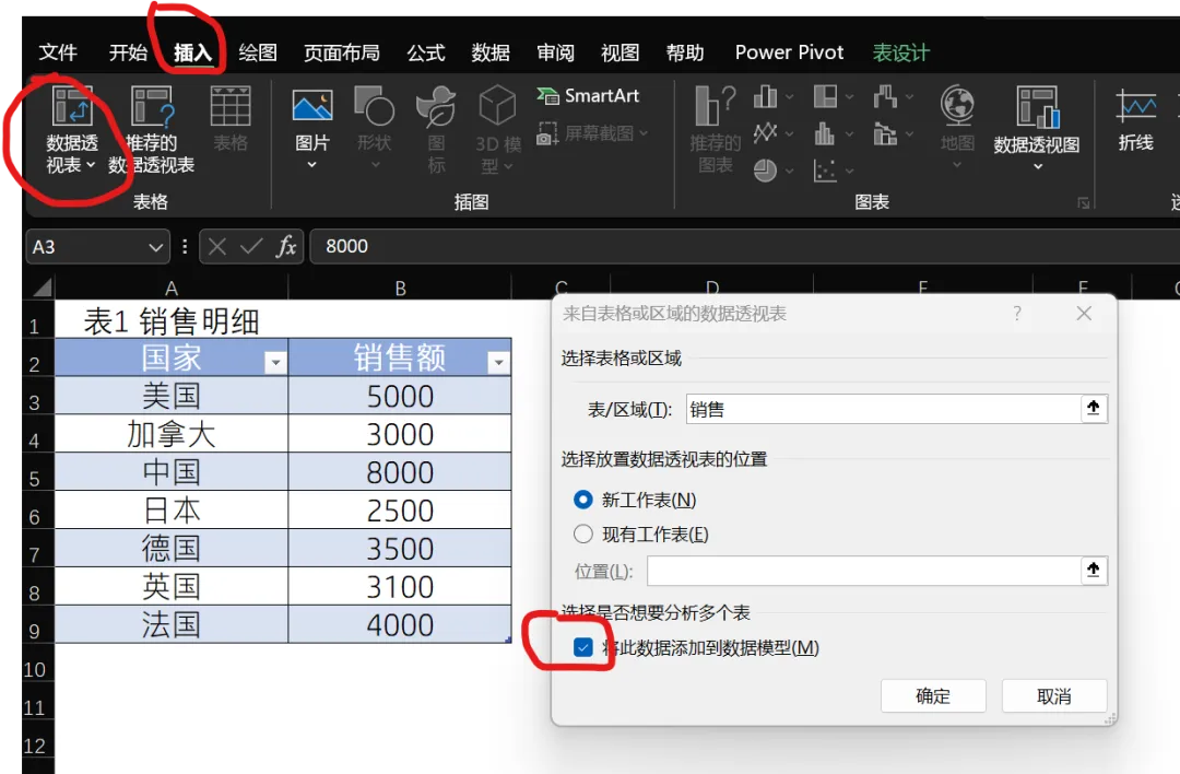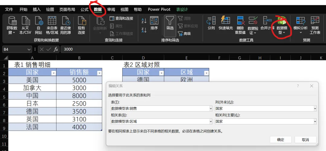 区域销售额为例,说明如何在Excel中创建数据模型。