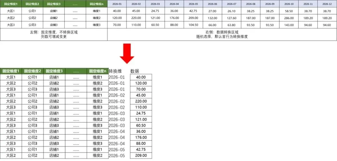 '随机选择要转换的区域,需含转换维度表头,如月度2026-01