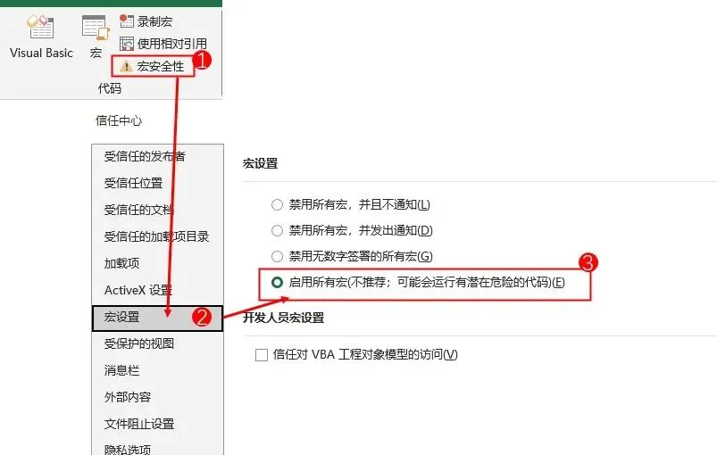 2.工具栏->开发工具->宏安全性->宏设置->启用所有宏