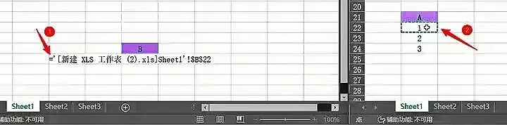 B列键入=,打开A列所在Excel,过程中不要有多余动作(随便乱点),找到A列所在的工作表,选中后(也是空心十字+单元格虚线)按回车。