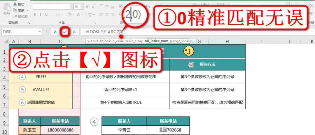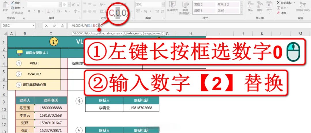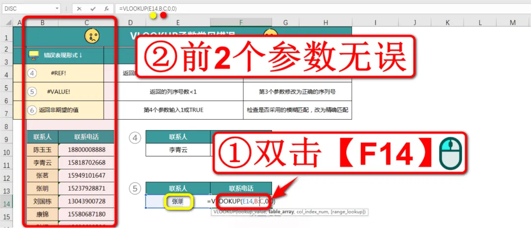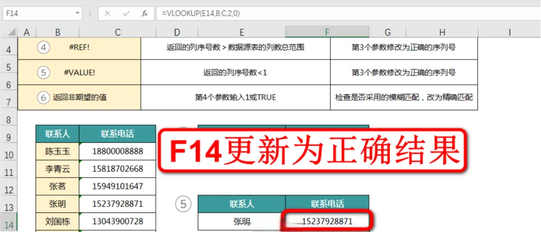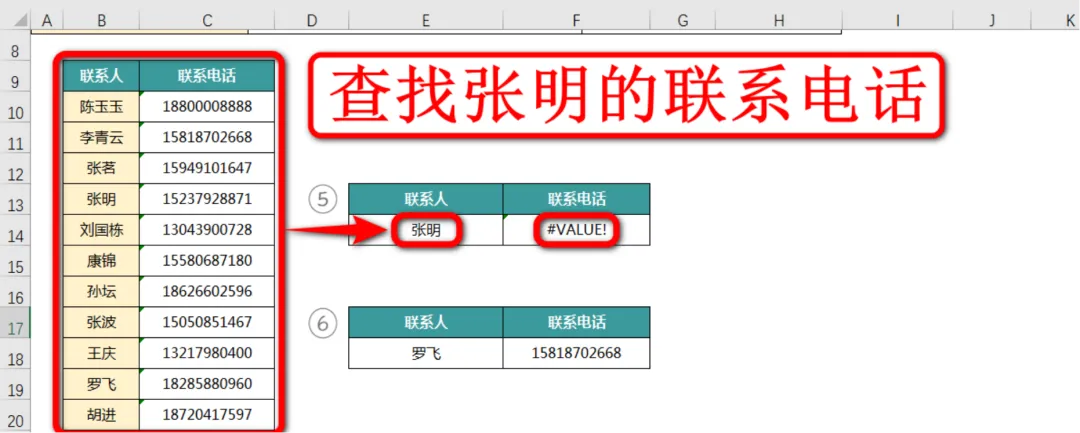 第5个错误案例,要查找张明的联系电话,此时报错#VALUE!,如下图: