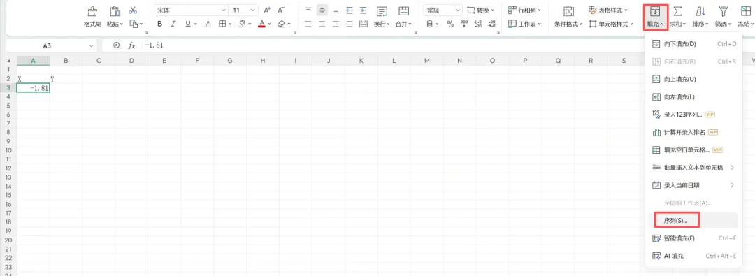 2. 点击顶部【开始】选项卡,在右侧找到【填充】功能,选择下拉菜单中的【序列】,弹出设置窗口;