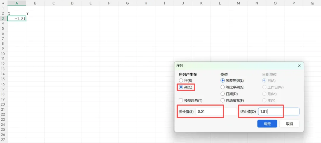 3. 窗口内完成三项配置:序列生产在【列】,步长值设置为0.01,终止值设为1.81;