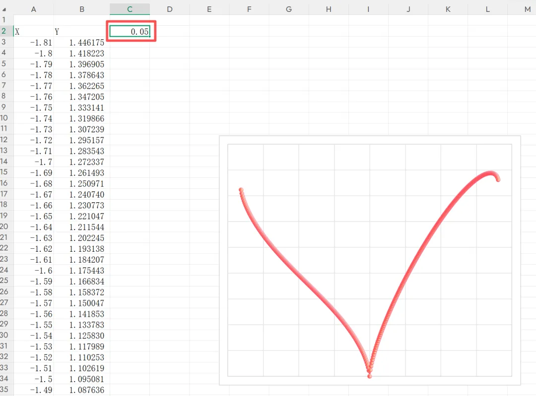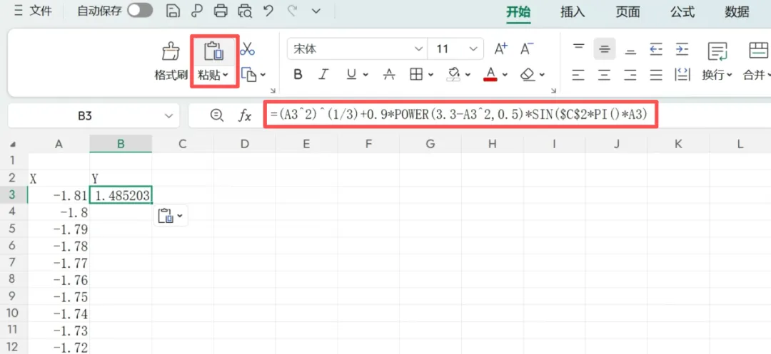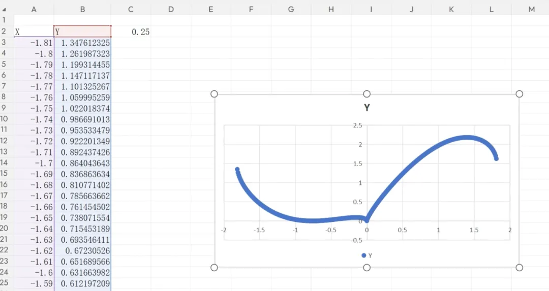 1. 在X轴数据列的相邻列(示例为A列X轴,B列Y轴)输入公式: