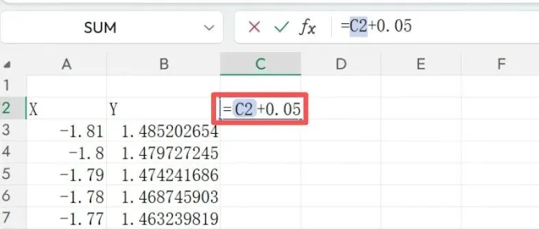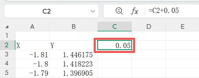 选中C2单元格,输入循环引用公式:=C2+0.05。