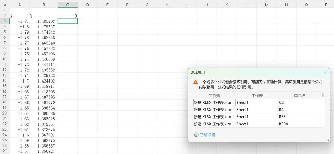 说明迭代计算未开启或者设置不正确,那么我们需要开启迭代计算(实现循环跳动),步骤如下: