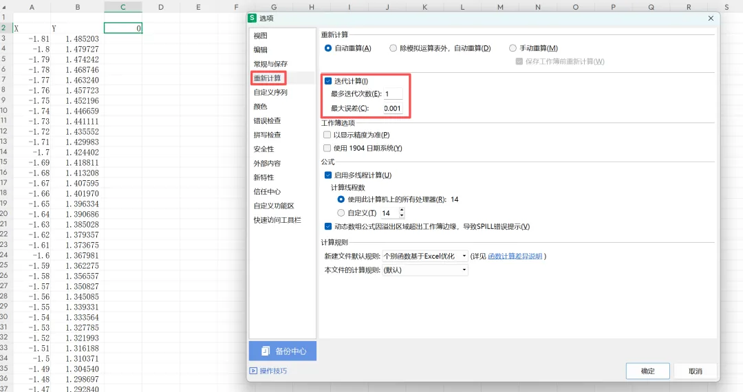 2. 在左侧导航栏找到【重新计算】选项,勾选【迭代计算】,并将最多迭代次数设置为1,最大误差设置为0.001;