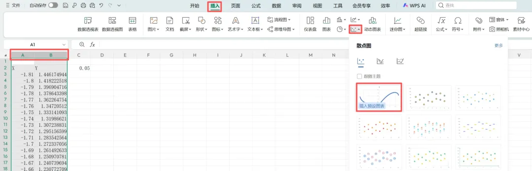 1. 同时选中X轴和Y轴的全部数据,点击顶部【插入】选项卡,找到【散点图】;