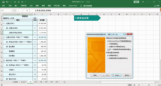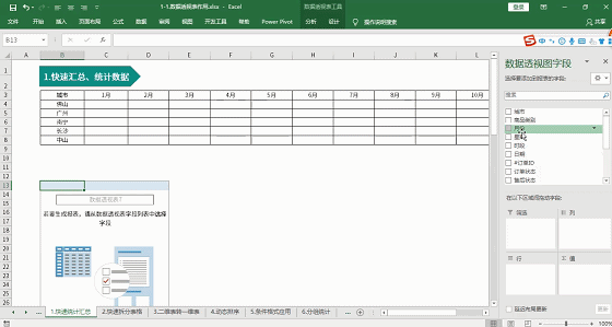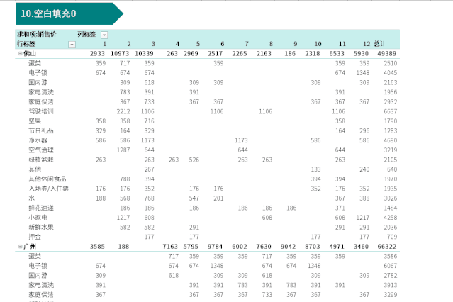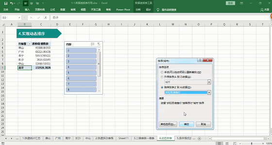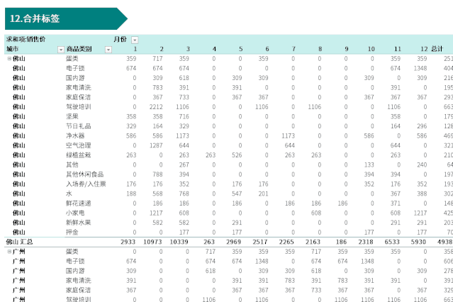 选中数据源,建立数据透视表后。分别拖动【城市】【月份】字段到【行】【列】区间,最后拖动【销售价】到【值】区间,即可快速汇总统计数据。日常你还在一个个拆分每个工作表分发给各子公司么,学会这个即可一键拆分工作表。把【城市】拖到【筛选区】,选择数【据透视表工具】→【分析】→【选项】→【显示筛选页】选择即可根据对应的每个城市拆分工作表。依次按下Alt D P键盘(不能一起按),调出数据透视表向导。【多重合并计算】,【单页字符】,选择数据源,接下来就按确定即可。建立数据透视表后,双击最后汇总项,从而得到一维的数据源。在行标签的数据项,【排序】【其他排序】,选择根据【销售额】降序从大到小排序,当数据源发生变化后,排序依旧根据销售额大小排序。这个就是一种小的交互图表,多图表组合就成为数据看板。如果是数值或日期在行标签列,可以根据组合汇总进行自动的分组。【分析】【创建组合】根据步长和起点值、终点值设置。只需要在透视表统计的数值双击,就能返回对应的数值数据源。也是按住依次按下Alt D P键盘(不能一起按),调出数据透视表向导。【多重合并计算】,【自定义字节】,依次选择【1月-6月】工作表的数据源分别添加,最后根据实际,选择【3个字段】分别命名后,确定即可。E01-10.空白处填充0值
