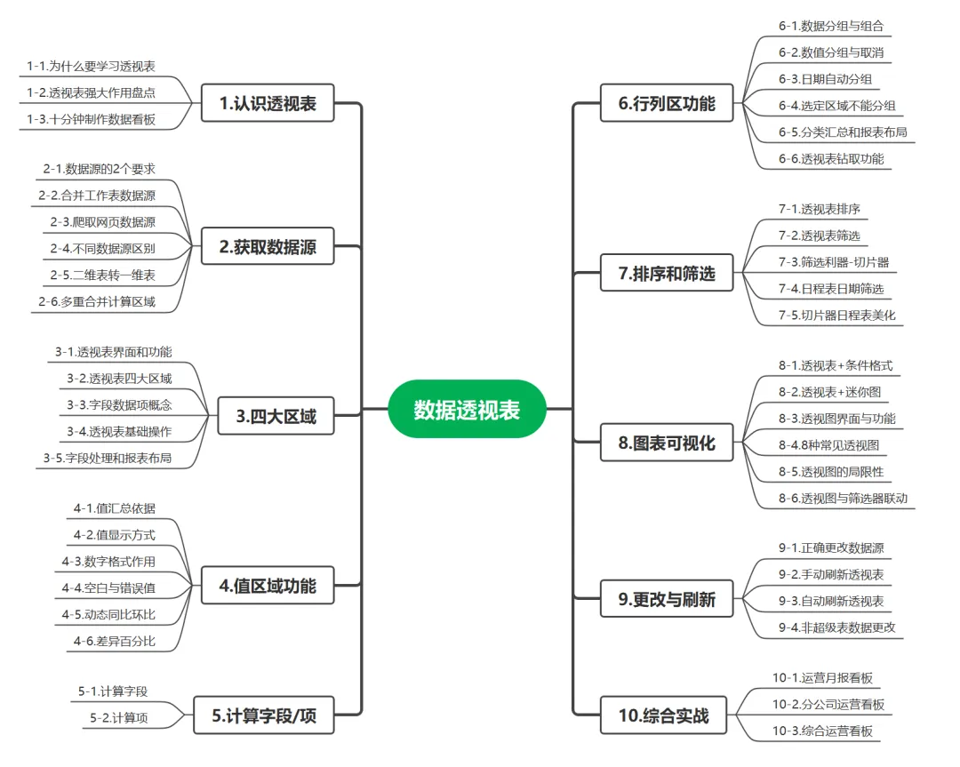 数据透视表分为10章节,一共56课时,累计时长350分钟,分为获取数据源、四大区域、组合、汇总依据、排序筛选、图表可视化等重要功能。
