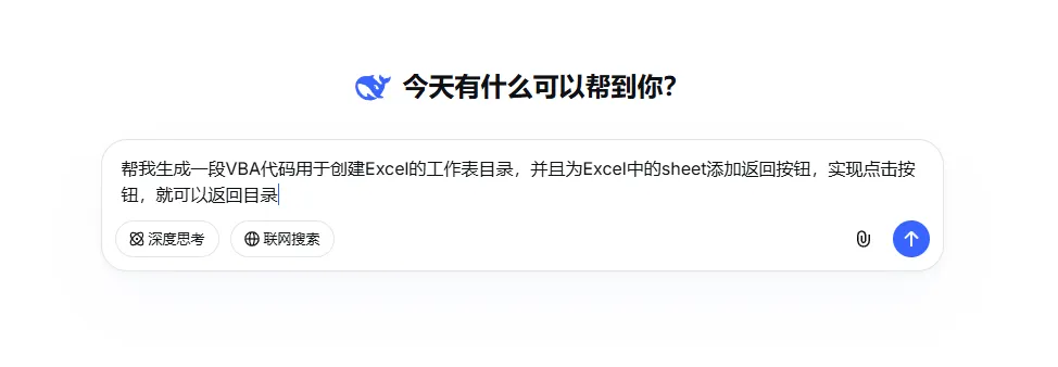 今天跟大家分享下我们如何将DeepSeek生成的VBA代码,做成按钮,将其永久保存在我们的Excel表格中,下次遇到类似的问题,直接在Excel中点击按钮,就能10秒搞定,操作也非常的简单代码可大家可以直接询问DeepSeek,我们就以新建工作表目录为例,跟大家简单的演示下,首先需要复制下方的代码。代码的询问方法可以以下方图片为例,就不在演示了,Sub 目录生成() Dim ws As Worksheet On Error Resume Next Sheets("目录").Delete With Sheets.Add(Before:=Sheets(1)) .Name = "目录" .[A1] = "目录" For Each ws In Sheets If ws.Name <> "目录" Then .Hyperlinks.Add .Cells(.UsedRange.Rows.Count + 1, 1), "", "'" & ws.Name & "'!A1", ws.Name On Error Resume Next ws.Shapes("返回").Delete ws.Shapes.AddShape(1, 10, 10, 50, 20).Name = "返回" ws.Shapes("返回").OnAction = "返回目录" ws.Shapes("返回").TextFrame.Characters.Text = "返回" End If Next End WithEnd SubSub 返回目录() Sheets("目录").ActivateEnd Sub