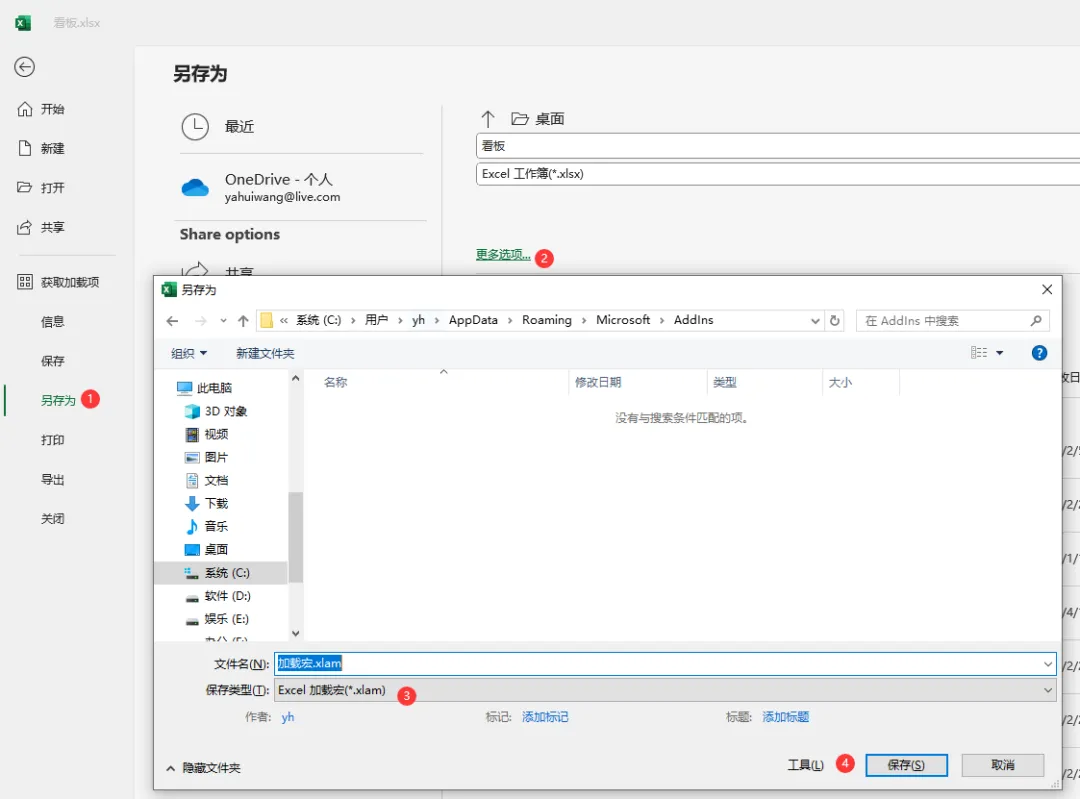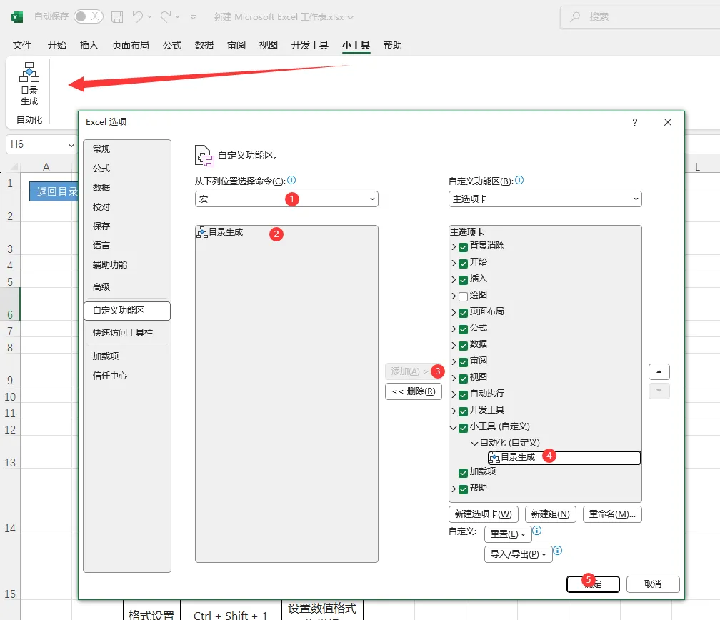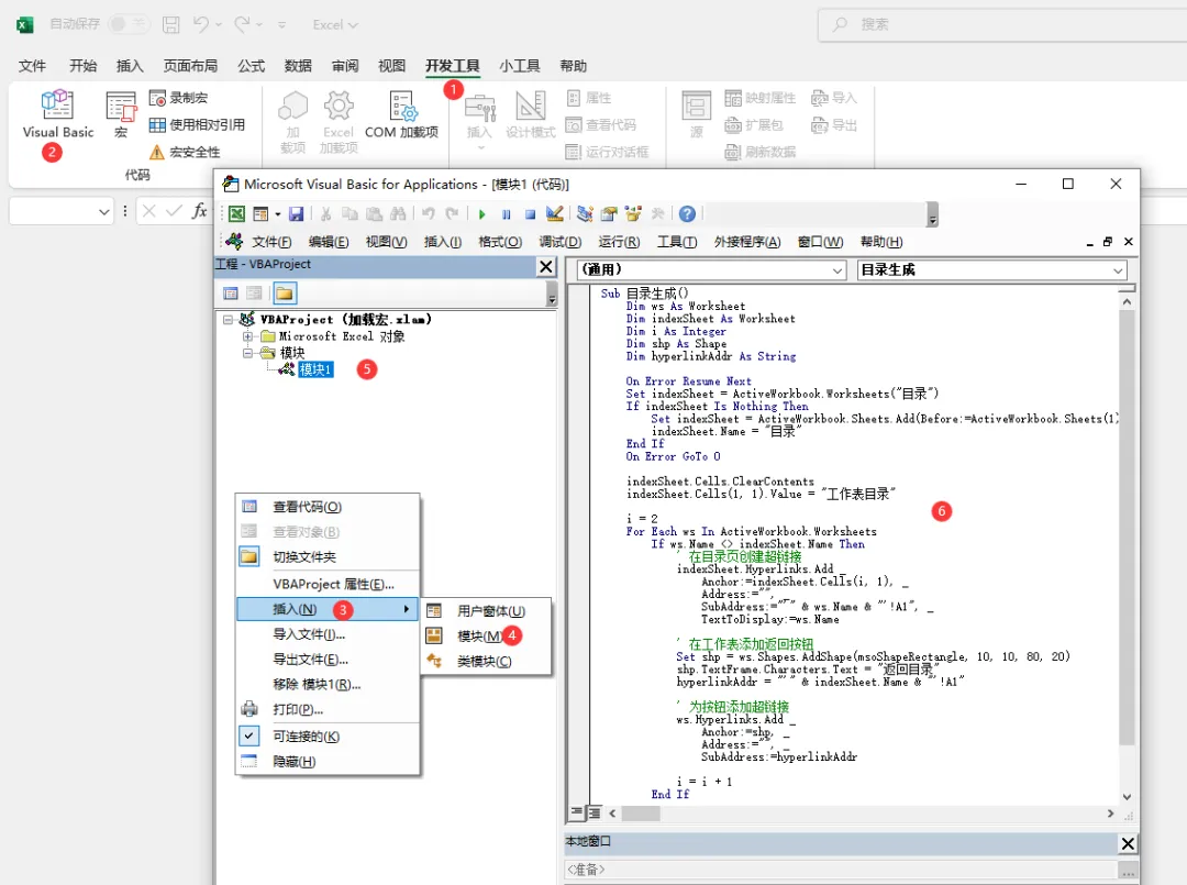 Xlam格式的文件是可以存储VBA代码的,将其放在对应的位置,以后就能在这台电脑中的所有Excel文件中调用这个代码了。首先需要新建的一个Excel文件,右上角点击文件,然后找到另存为,然后点击更多选项,在跳出的窗口中找到【保存类型】将类型设置为【xlam】,然后点击保存文件就会默认的保存在【C:\Users\yh\AppData\Roaming\Microsoft\AddIns】这个路径中电脑不一样,路径一般也不会完全一样的,大家可以直接搜下方法路径,一般都是有的【AppData\Roaming\Microsoft\AddIns】找到刚才创建的xlam文件,然后双击打开它,点击【开发工具】找到【visiual basic】,然后点击鼠标右键找到【插入】创建【模块】找到新建的模块,将刚才复制的代码直接粘贴到对应的位置,点击下保存首选需要点击【文件】然后在最下方找到【选项】来调出【Excel选项】之后需要在右侧的选项卡中选择【新建选项卡】然后点击【重命名】将名字定义为【小工具】最后点击【新建组】也是点击重命名,将名称设置为【自动化】最后在左上角的区域中选择【宏】找到【目录生成】点击【添加】然后再点击【确定】这样的话就可以将按钮永远的放在Excel表格中,下次想要创建目录,直接点击生成即可,至此就设置完毕了