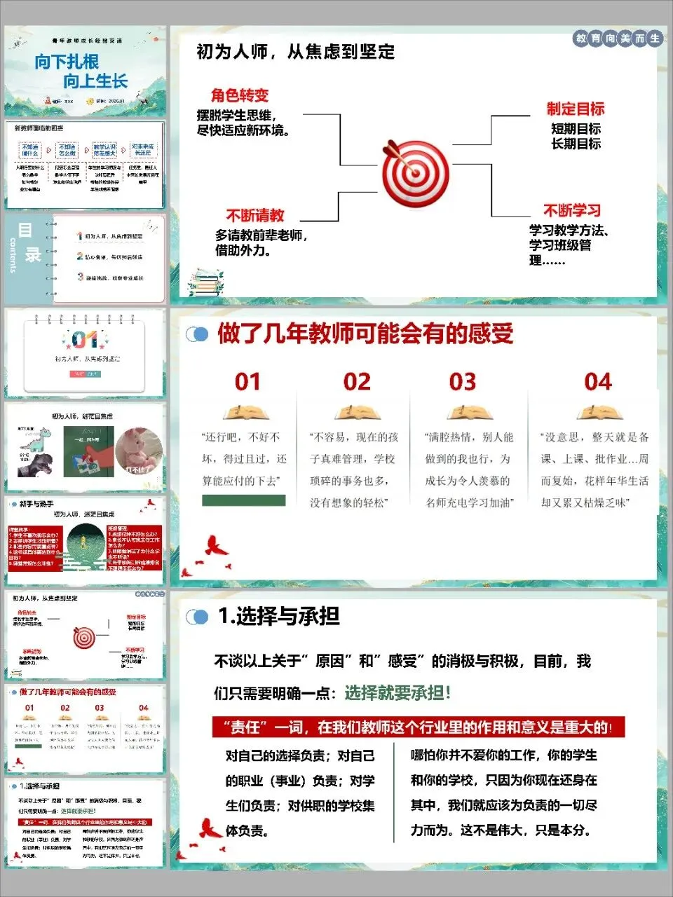 4. 完成最重要的心态建设:选择与承担。 我想说,无论我们当初因何选择这份职业,既然身处其中,我们肩上就有了实实在在的责任。对自己的选择负责,对这份事业负责,对眼前每一个鲜活的学生负责,对我们身处的学校集体负责。这份责任,不一定源于伟大的热爱,它首先是一种职业的本分。尽了这份本分,我们才能问心无愧,才能获得内心的安定。