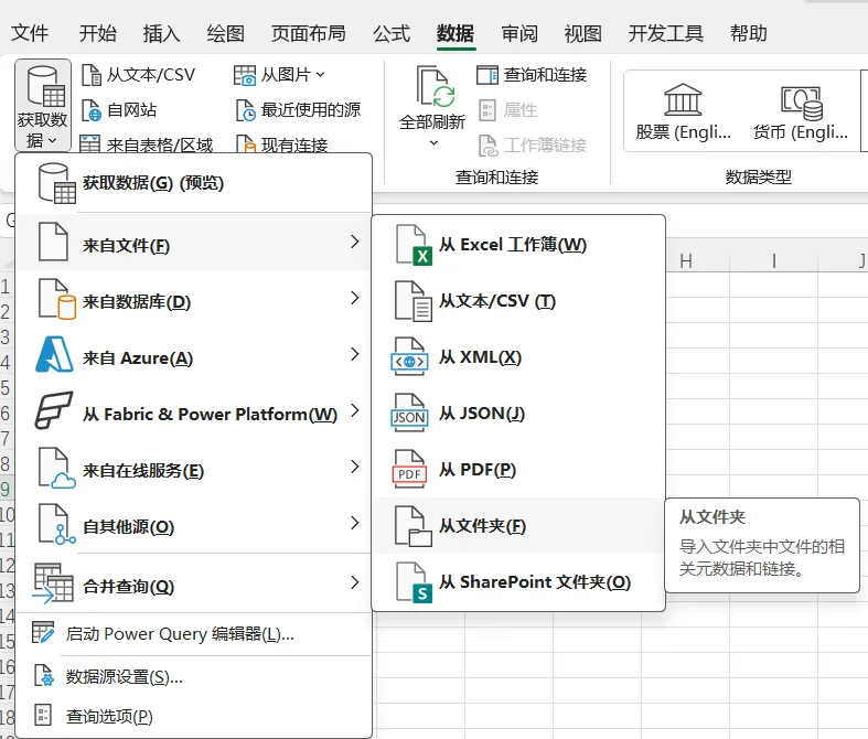 Excel界面 → "数据"选项卡 → "获取数据" → "来自文件" → "从文件夹" → 选择"销售数据"文件夹