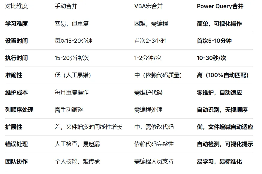 "作为销售运营经理,我需要汇总15个销售团队的数据。有些团队先写客户名,有些先写销售额。用Power Query后,我再也不用一个个调整了。更重要的是,当有团队离职交接时,新同事无论怎么排序列,都不影响我的合并工作。" —— 张先生,科技公司销售运营