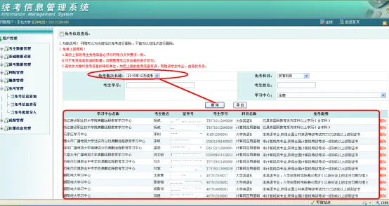 统考的重要性。《教育部关于开展现代远程教育试点高校网络教育部分公共基础课全国统一考试试点工作的实施意见》(教高[2004]5号)规定:所有统考科目成绩合格作为教育部高等教育学历证书电子注册资格的条件之一。1.统考信息管理系统功能不完善,不能满足高校和学习中心统考工作需求统考信息管理系统(本案例以2021年3月之前网址www.cdce.cn为例,以下简称统考系统)的高校及学习中心账户只能查询每个统考批次如2020年12月的统考成绩或免考上报结果(见下面截图)。高校及学习中心可以通过考生数据管理,查询单个学生的统考成绩或免考结果,但没有所有学生的统考成绩或免考情况详细数据的整体查询与导出功能,无法直接掌握学生的统考通过情况,难以有针对性地督促学生报名考试。