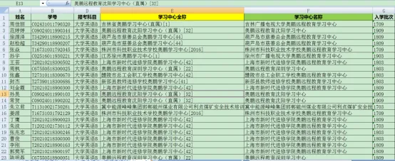 高校统考工作负责人将所有学习中心需要的统考各环节数据整理汇总后,不仅可以为学习中心节省大量的人力物力,同时也能在某种程度上保证数据的可靠性。(二)Excel数据分析在校验统考上报数据中的应用高校上报统考跨省异地报考、统考免考和统考重考数据必须做到100%准确。虽然统考系统学生基本信息数据来自学信网,但按照流程对接数据总有时间差。例如有的学生由于在学信网上学历前置,在统考系统没有基本信息,这类学生在统考系统无法报考,也不能免考。有的学生在学信网已经更改姓名,但根据流程只在统考报名前三天左右才将学籍异动信息从学信网更新到统考系统。有些申请数据由学习中心手工录入,难免有出入,比如学号和姓名张冠李戴、身份证号码错误、重复数据等,如果不校验容易在统考系统上报失败或者错误上报。因此,需要使用Excel将各种统考上报数据与学信网在籍学生信息、统考系统学生信息进行双向反复校验,保证数据准确。下面以统考重考数据审核与校验为例详细说明:1.准备基础数据:包括学生申请数据,学生在籍学生数据,统考系统学习中心、学生基本信息数据,统考历次大学英语B科目合格、免考,90分(含90)以上汇总数据。2.校验修改数据:数据中的学号、姓名、学习中心等信息必须准确无误才能上报成功。例如,下表中黄色标记“学习中心全称”信息来自奥鹏平台,绿色标记“学习中心全称”信息来自统考系统(见下表),可以看出两者明显不一致,而重考上报数据要以统考系统为准,因此,需要使用Excel逐一校验,将不匹配数据按要求完成修改。