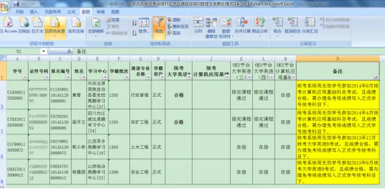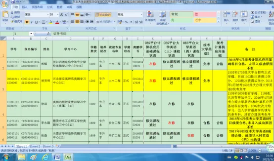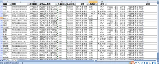 因统考报名与考试时间一般间隔较长(两个月),对成人学生而言,容易忘记。统考报考结束以后,院校管理员账户可以导出报名成功数据,与统考通过情况数据再次合并,整理出各学习中心报考成功学生名单,并可以准确查找出考生中因统考未毕业学生的报考数据作为重点对象,考前推送给学习中心(见下面截图),提醒考生持有效证件和准考证按时参加考试,缓解工学矛盾影响。