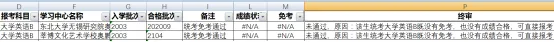 (三)Excel数据分析在统考成绩管理与毕业审核中的应用东北大学2009及以前批次学生教学计划中的统考课程以统考对应科目成绩及免考结果记载,在平台导入统考成绩时存在诸多问题。为保证统考成绩与免考结果与平台对应统考课程成绩一致,高校工作人员需要用Excel多次反复核对校验(见下表)。