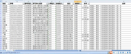 3.筛选不符合重考报考条件学生:东北大学统考大学英语B重考报名对象为在籍学生,仍有已毕业学生申请重考,需要将申请数据与学信网在籍学生的学籍状态进行比对,筛出不符合重考报考条件的已毕业学生(见下表)。与统考成绩汇总、统考免考汇总比对,判断符合统考报考条件名单,筛出未合格未免考名单(见下表)。