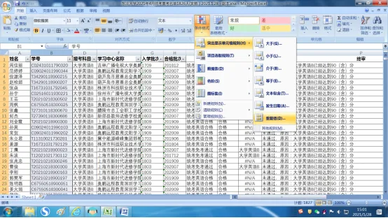 用Excel条件显示,筛出重复申请数据,删掉重复数据,因为统考系统不支持重复上报(见下表)。