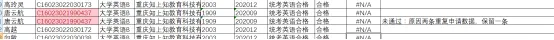 与大学英语B90分成绩汇总比对,筛出已经达到90分,不需要重考,但又重复申请名单(见下表)。