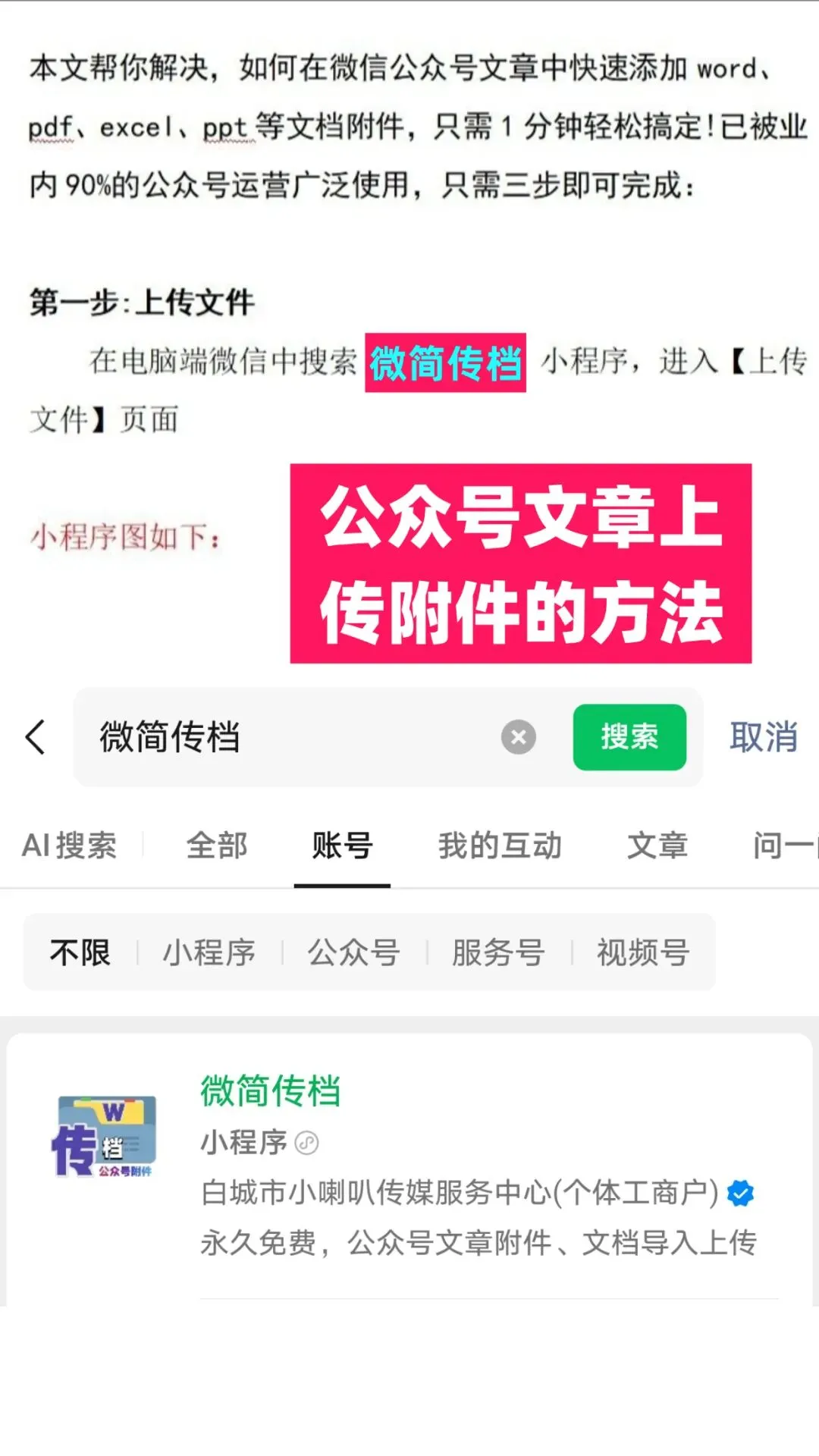如何在微信公众号中添加附件支持Word、Excel等文档(图片教程)今天给大家介绍一款微信公众号运营的小工具微简传档