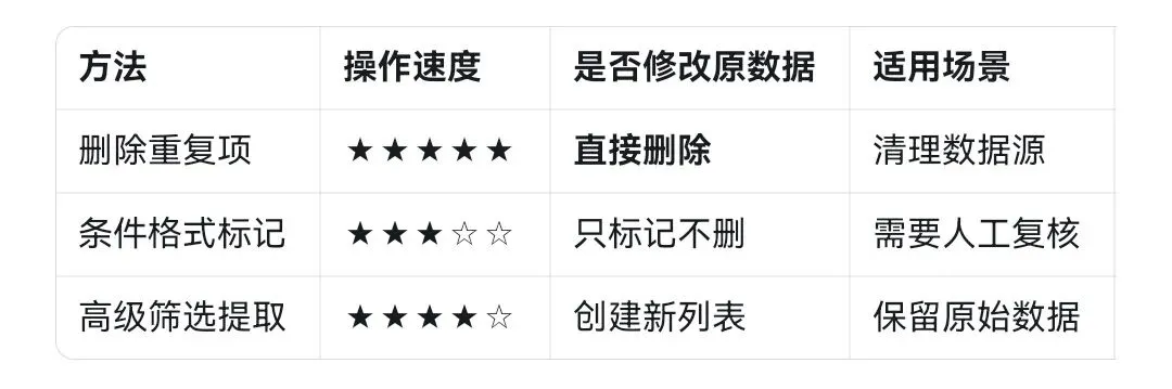· 删除前想清楚:依据哪些列判断重复?