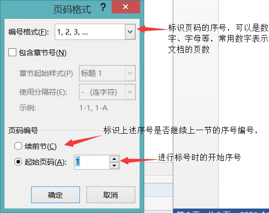 在"设置页码格式"选项提供的菜单中,可以通过"编号格式"进行页面编号的形式,包括数字、字母、繁体数字序号等,通常使用默认的数字编号来标志文档的页数。通过页码编号的"续前节"选项选择是否当前节的编号连接在上一节的编号之后,如上一节最后一页的编号为"3",则本节的第一页的编号即自编号"4"开始。这里由于是需要对第二小节独立加入页码,故而不点选该选项。对应的,可以通过"起始页码"选项选择当前节编号开始的页码,如输入"1",则当前节第一页的编号为"1"。最后点击确定完成页码格式设置。