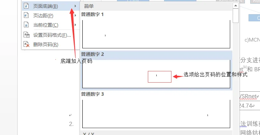 4.设置好上述插入页码的格式后,在上述菜单中,选择"页面底端"选项,表示在页面的底端插入页码,在出现的下拉菜单中选中所需的页码插入位置和样式即可。所插入的页码即根据上述设置的页码格式进行编号,并以对应样式显示在对应位置上。如图示样式中,页码出现在页脚的中央,使用普通的数字样式。