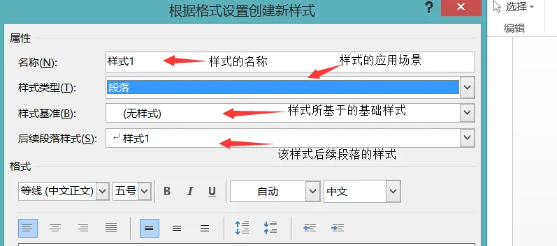 样式基准:定义新建的样式以何种已有的样式作为模板,若新建样式,则可以选择"(无样式)"选项。注意若使用其他基础样式作为基准,则基准样式改变时,基于基准样式创建的新样式也会随之自动修改。