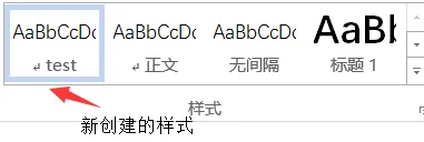 4.点击 "确定" 按钮后,即完成该样式的设置。此时可以在 "开始" -> "样式" 工具栏看到新创建的名为 "test" 的样式。右键上述新创建的样式,可通过 "修改" 选项调整该新建样式的设置。用户选中某一部分的文本段落,再点击上述 "test" 样式,即可将选中的段落设置为对应的 "test" 样式所设定的格式。