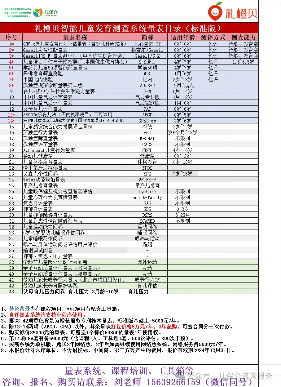 儿心量表II、Gesell、DDST、S-S语言评估及干预、ADOS-2、S-M、比内测验、学龄前50项、父母育儿评估、儿童气质评估、ABCD快乐育儿法等更多儿保发育量表课程培训考证、测评工具箱、评估系统。