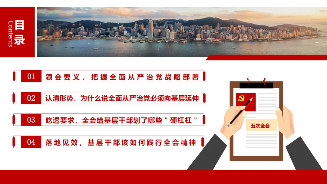 大家好!今天我们深入学习解读二十届中央纪委五次全会精神。这次全会是在"十五五"时期开局起步的关键节点召开的一次十分重要的会议,咱们基层党员干部是政策执行的"最后一公里",是联系群众的"贴心人",全会精神学得深不深、悟得透不透、落实得好不好,直接关系到党中央决策部署在基层的落地成效,关系到党在群众心中的威信形象。下面我们开始今天的讲课。(一)基层是政策落地的"主战场",容不得"中梗阻"。(二)基层是联系群众的“桥头堡”,容不得“坏形象”。(三)基层是腐败易发的"风险点",容不得"宽松软"。同志们,二十届中央纪委五次全会为我们基层全面从严治党指明了方向、提供了遵循。全面从严治党永远在路上,基层党风廉政建设没有休止符。作为基层党员干部,我们身处正风反腐的最前沿,肩负着维护群众利益、巩固党的执政根基的重要使命。让我们以全会精神为指引,牢记初心使命、坚守纪律底线,以更加坚定的信念、更加务实的作风、更加清廉的形象,在基层岗位上履职尽责、担当作为,为实现"十五五"时期目标任务、推进中国式现代化建设贡献基层力量!
