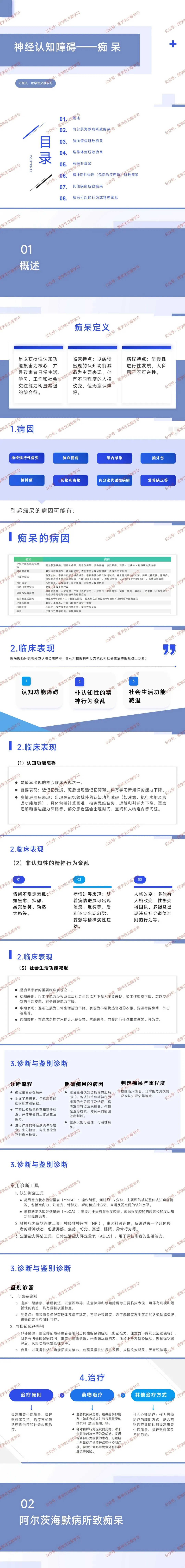 治疗:胆碱酯酶抑制剂(多奈哌齐、卡巴拉汀)改善轻中度认知;美金刚用于中重度患者;抗抑郁药 / 非典型抗精神病药对症处理精神症状;心理社会治疗延缓衰退;