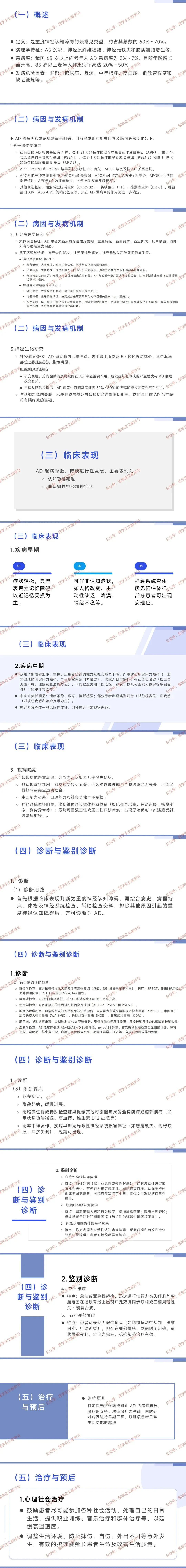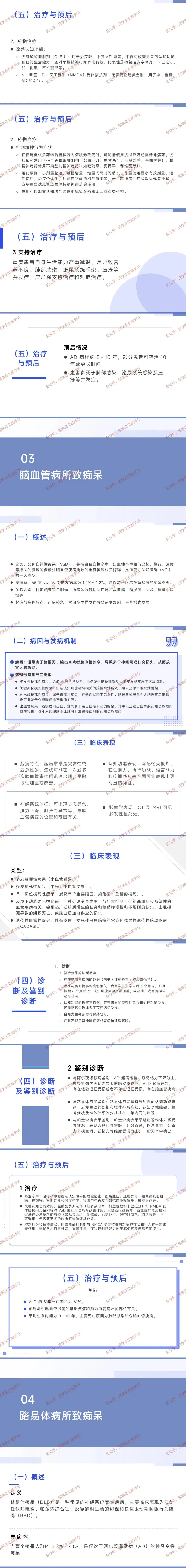 鉴别:与血管性痴呆(VaD,起病急、有卒中史)、额颞叶痴呆(FTD,早期人格 / 行为异常)、路易体痴呆(DLB,波动性认知 + 帕金森症状)区分。