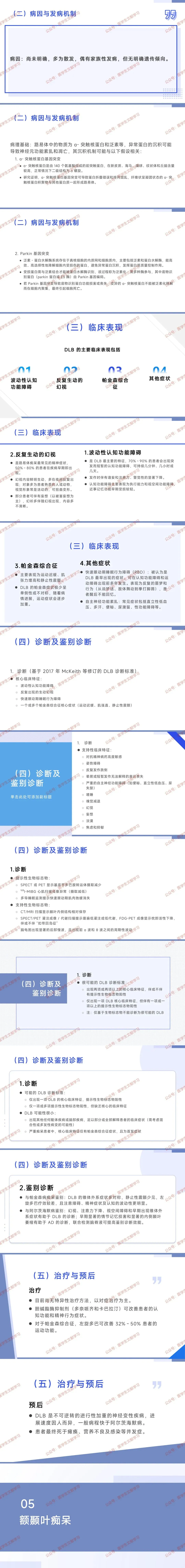 诊断(2017 年 McKeith 标准):核心特征(波动性认知、幻视、RBD、帕金森症状)+ 提示性生物标志物(基底节多巴胺转运体摄取减少、¹²³I - MIBG 心肌扫描异常),两项核心特征或一项核心 + 一项标志物可诊断 “很可能 DLB”;