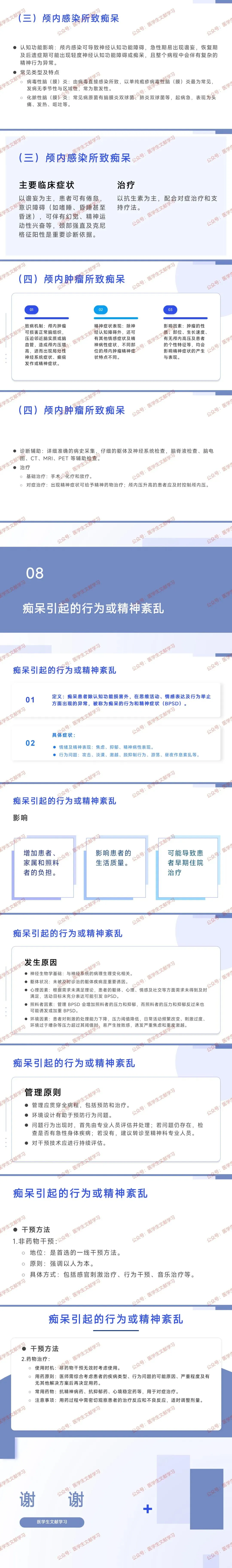 颅内感染:病毒性 / 化脓性脑(膜)炎急性期易致谵妄,恢复期可能遗留痴呆,伴精神行为异常,治疗以抗生素 + 对症支持为主;