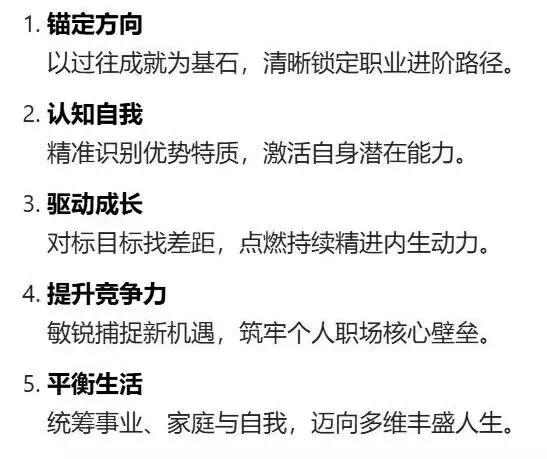张老师一阵查找,说:第1条中的“锚定人生方向”与第2条中的“明晰职业定位”有部分重叠;第3条中的“激发成长动力”与第4条中的“释放潜能”有交叉,诸如此类。