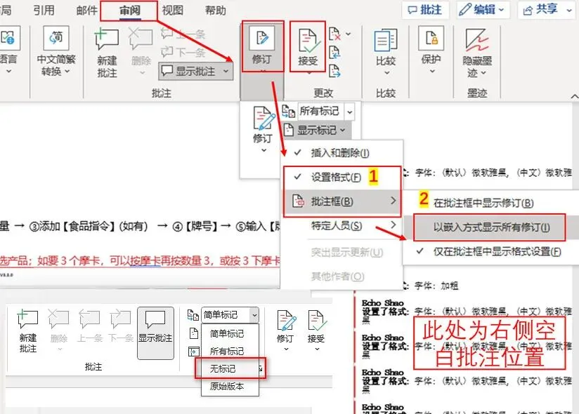 3或者点击“审阅”-“修订”-“批示框”-勾选“以嵌入方式显示所有修订”;