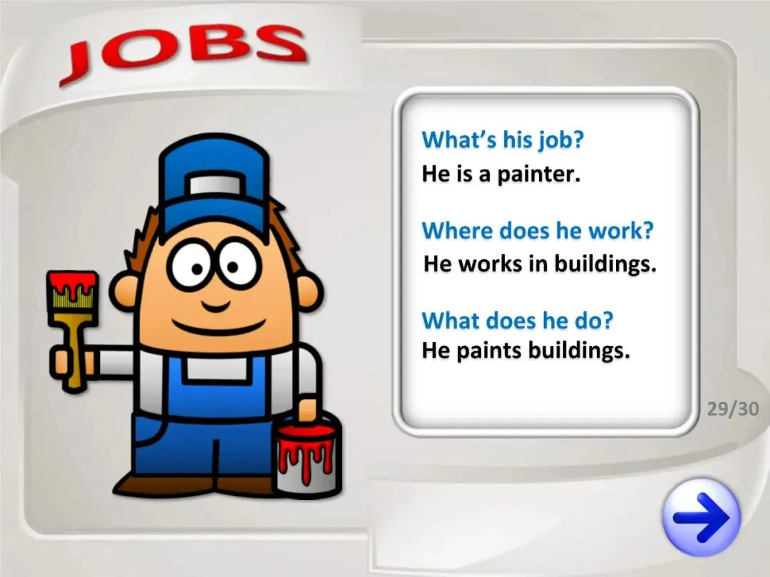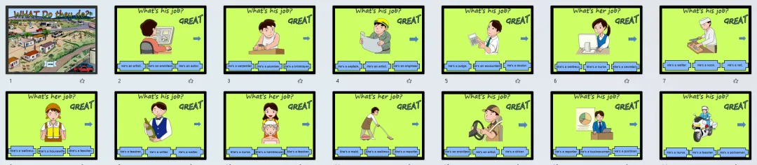 今天分享的是职业主题英语学习素材,包含5套精美PPT、6套教具、4套练习和4首歌曲!