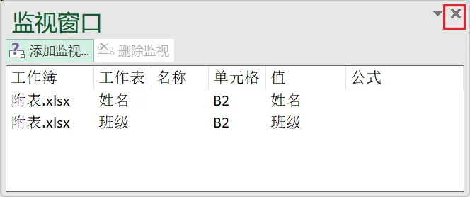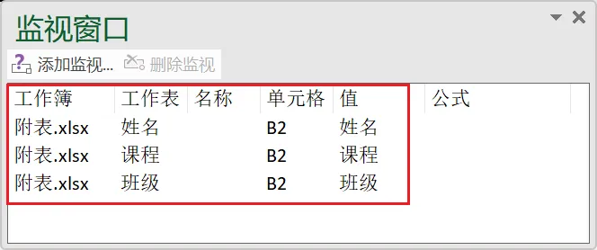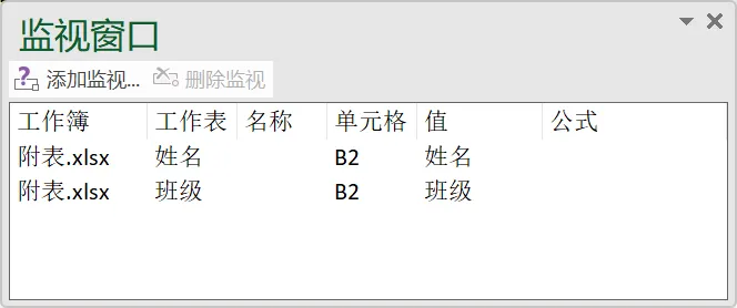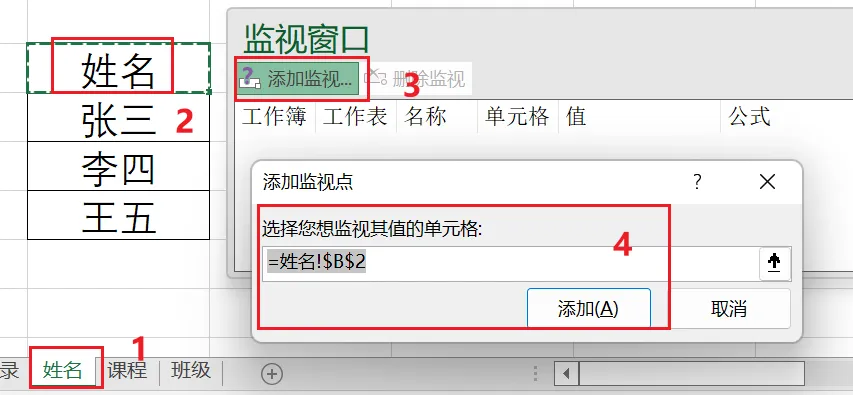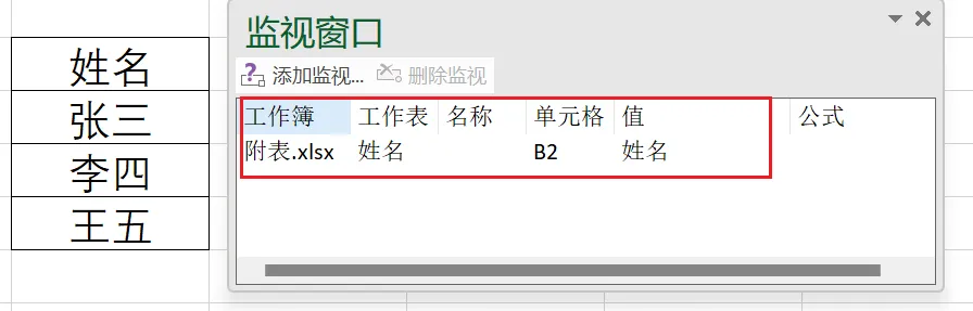 在表格 “姓名” 中,选中 姓名 单元格,然后点击 监视窗口中的 添加监视 按钮,弹出 添加监视点 对话框,点击 添加 后就会将 姓名 单元格的引用添加到监视窗口中